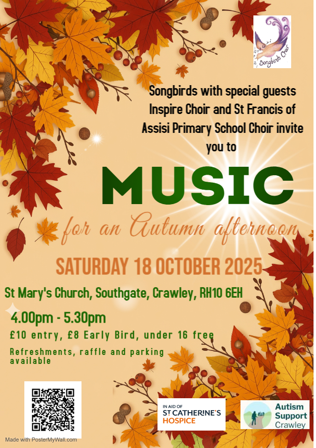 Our next concert will be on Saturday 18th October 2025 at St. Barnabas Church, Pound Hill, Crawley. Songbirds are delighted that we will be joined by Inspire Choir and St Francis of Assisi school choir. All profits will go to Songbirds Charities for 2025, St Catherine’s Hospice and Autism Support Crawley. Come and enjoy some great music.